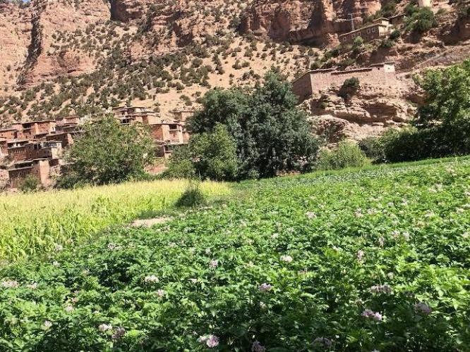 Début du trek à travers les champs en terrasses et les villages traditionnels jusqu’au village d’Arous, puis montée progressive vers le plateau (aussi appelé plateau de Tafnfant), situé au pied du M’Goun.